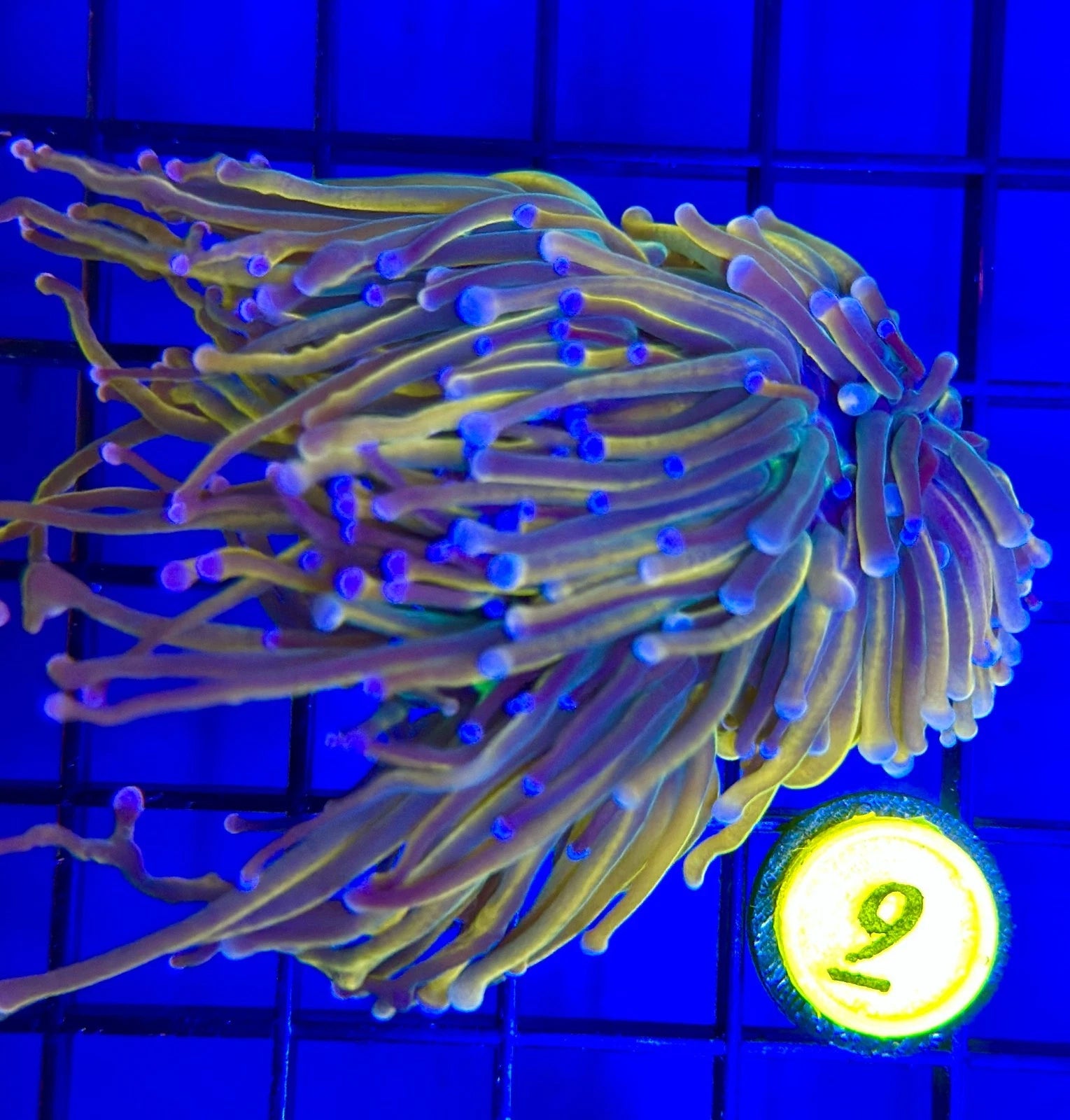 Torch corals are slightly less common than their Euphyllia cousins the Frogspawn coral (Euphyllia divisa) and the Hammer coral (Euphyllia anchora). They have long tentacles that terminate in a single brightly colored tip giving them the appearance of a lighted torch as they sway with the currents. Torch corals can come in some incredible colors such as neon green, deep purple, and the highly desirable Golden Torch. Torch corals like all Euphyllia are known to extend sweeper tentacles aggressively when situated too close to other corals. This hostile reaction can damage or kill nearby corals, so it is important to be aware of placement at all times.