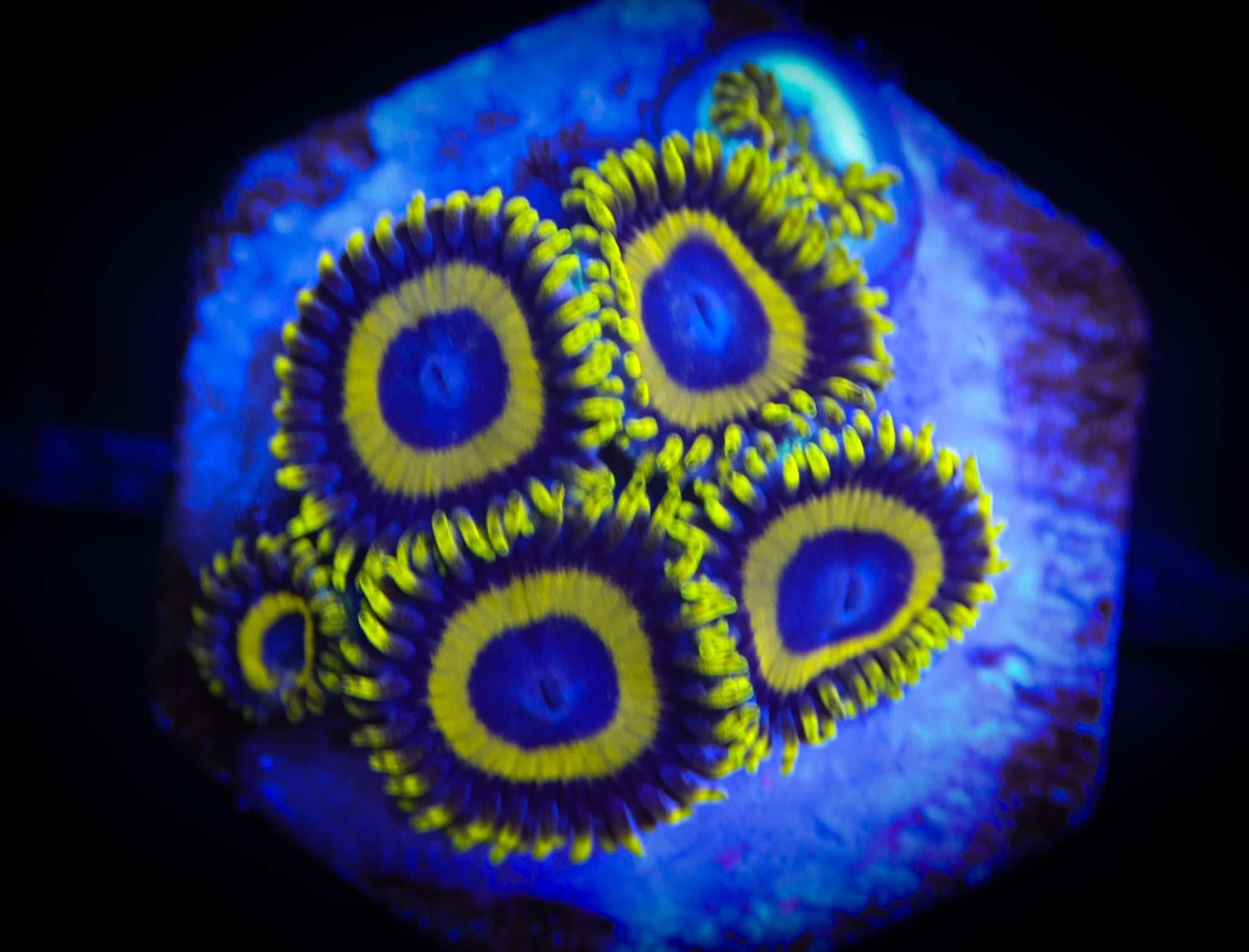 Zoanthids belong to the same Subclass as stony corals and corallimorphs. They share 6-fold symmetry but lack a calcium-based skeleton.