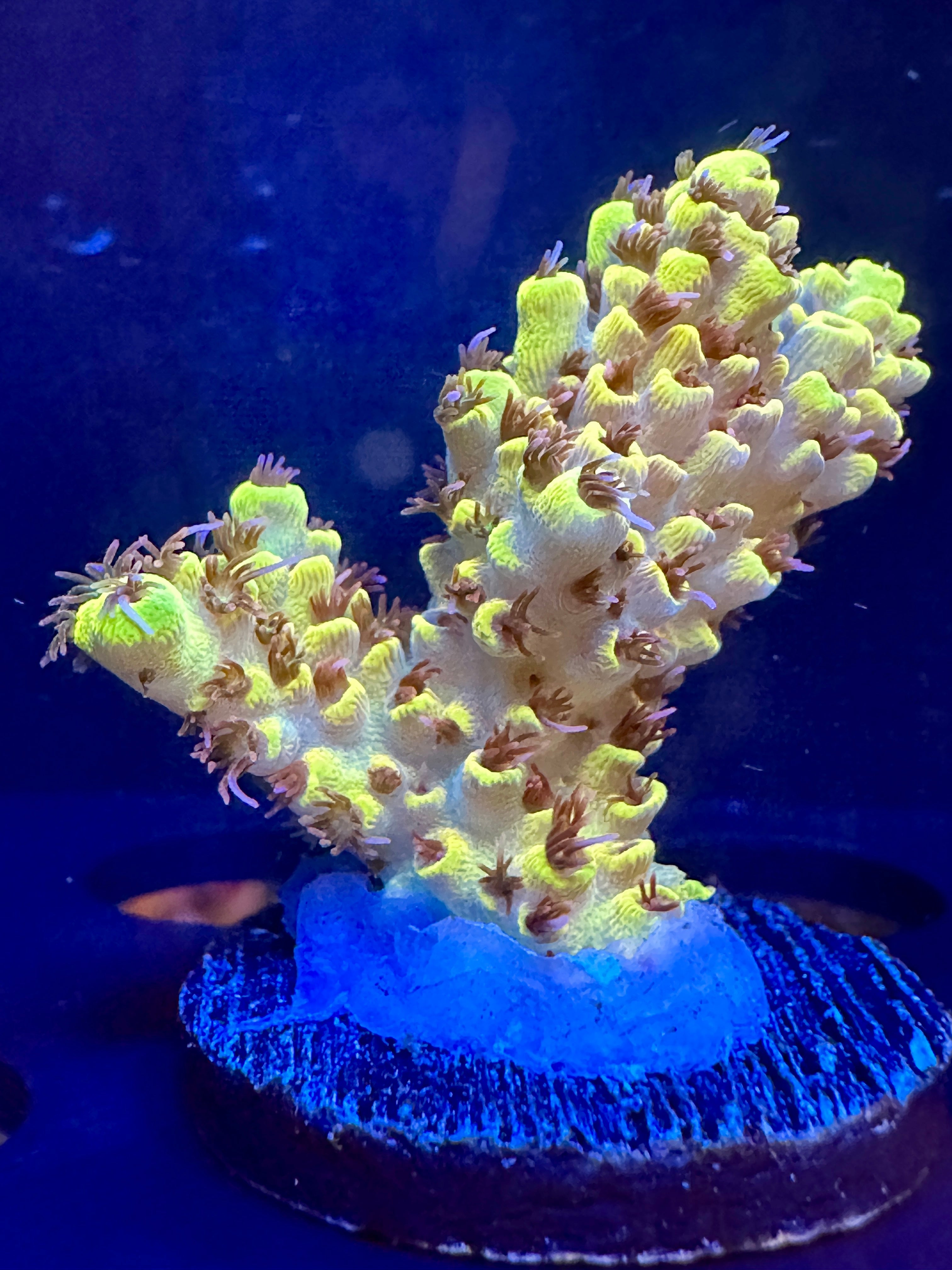 Acropora are the crown jewel of the SPS world.  No other genus has the sheer number of species as Acropora and when reef aquarists talk about the requirements to keep an SPS system, they are talking specifically about the care requirements of Acropora.  Having said that, Acropora are one of the most difficult corals to keep.  They are highly sensitive to changes in water chemistry and require the most in terms of flow and light.  Many experienced hobbyists have struggled keeping Acropora long term, but that is part of the attraction to this coral.  Lastly, Acropora benefit greatly from a well established aquarium, preferably one that has been set up at least for 1 year. Please see below for additional care tips for Acropora.