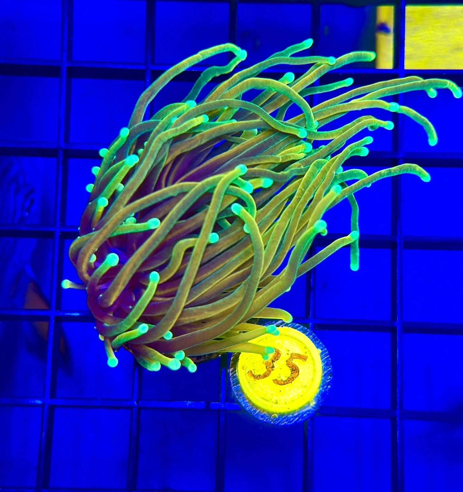 Torch corals are slightly less common than their Euphyllia cousins the Frogspawn coral (Euphyllia divisa) and the Hammer coral (Euphyllia anchora). They have long tentacles that terminate in a single brightly colored tip giving them the appearance of a lighted torch as they sway with the currents. Torch corals can come in some incredible colors such as neon green, deep purple, and the highly desirable Golden Torch. Torch corals like all Euphyllia are known to extend sweeper tentacles aggressively when situated too close to other corals. This hostile reaction can damage or kill nearby corals, so it is important to be aware of placement at all times.